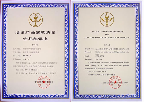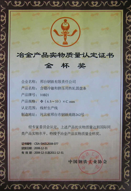 Wire 10B21φ6.5-10mm for cold forging awarded the Gold Cup Prize of Metallurgy products.