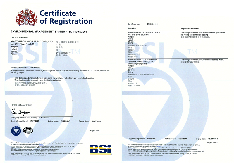 Xingtai Steel passed the certification of ISO 14001:2004.