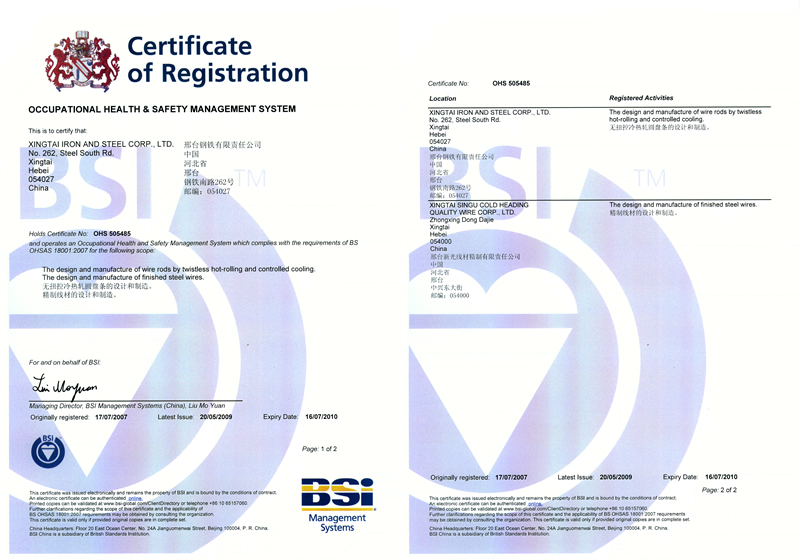 Xingtai Steel passed the certification of OHSAS 18001:1999.