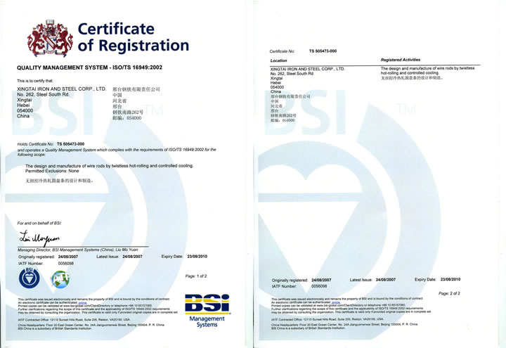 In August 2007, Xingtai Steel passed the certificate of ISO/TS16949:2002 (International Automobile Industry Quality Management System Certificate.)