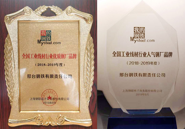 At the "Mysteel China Industrial Wire and Fastener Industry Chain Summit Forum 2019" held in Shanghai, the judging panel selected the "high-quality brand of national industrial wire industry" and "popular brand of national industrial wire industry", which was based on the brand, quality and market feedback of domestic steel mills from 2018 to 2019. Xingtai Steel won these two titles.