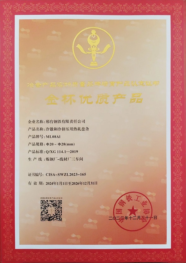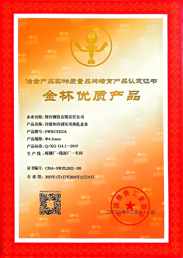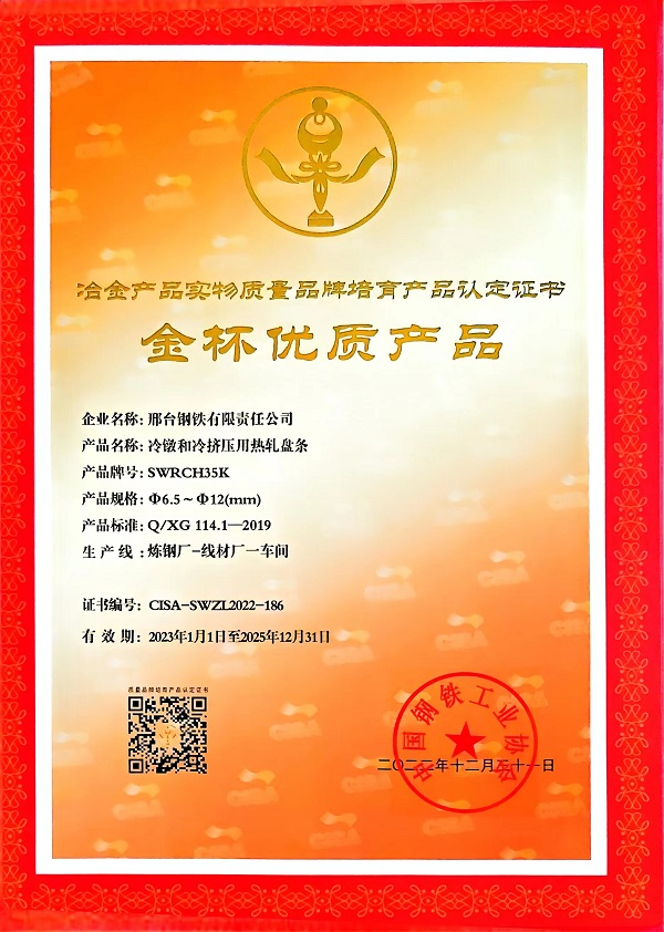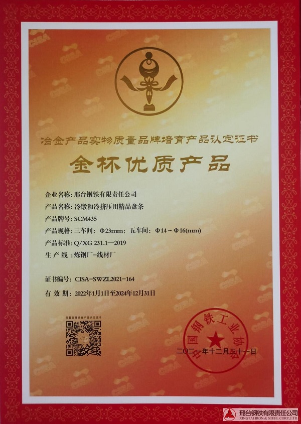 冷鐓和冷擠壓用精品盤條SCM435φ23mm;φ14-φ16mm規(guī)格獲冶金產(chǎn)品實(shí)物質(zhì)量金杯優(yōu)質(zhì)產(chǎn)品認(rèn)定證書(shū)