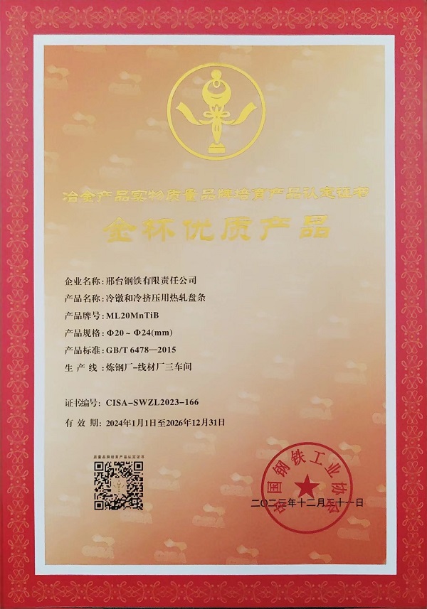 冷鐓和冷擠壓用熱軋盤條ML20MnTiBφ20-φ24mm規(guī)格獲冶金產(chǎn)品實(shí)物質(zhì)量金杯優(yōu)質(zhì)產(chǎn)品認(rèn)定證書(shū)