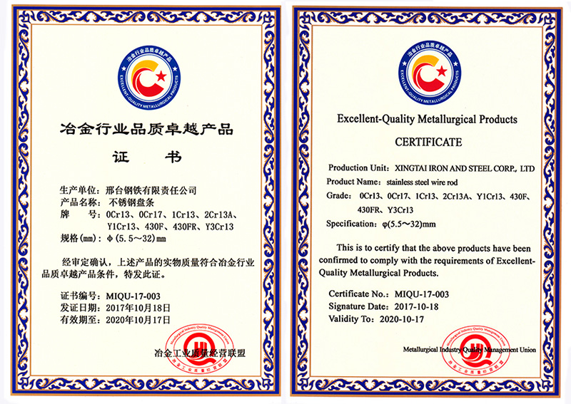 不銹鋼盤條0Cr13、0Cr17、1Cr13、2Cr13A、Y1Cr13、430F、430FR、Y3Cr13共8個(gè)牌號φ5.5- 32mm規(guī)格獲冶金行業(yè)品質(zhì)卓越產(chǎn)品