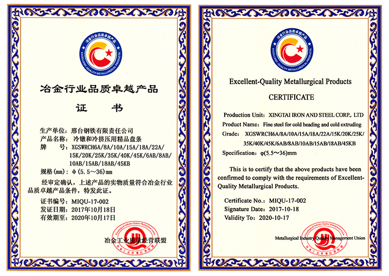冷鐓和冷擠壓用精品盤條XGSWRCH6A/8A/10A/15A/18A/22A/15K/20K/25K/35K/40K/45K/6AB/8AB/10AB/15AB/18AB/45KB共18個(gè)牌號φ5.5- 36mm規(guī)格獲冶金行業(yè)品質(zhì)卓越產(chǎn)品