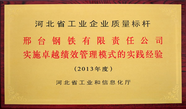 2013年7月12日,省工信廳在石家莊召開了2013年第五期國家新型工業(yè)化產(chǎn)業(yè)示范基地質(zhì)量標桿經(jīng)驗交流會,會上舉行了省質(zhì)量標桿授牌儀式,邢鋼公司參加會議并接受了授牌。