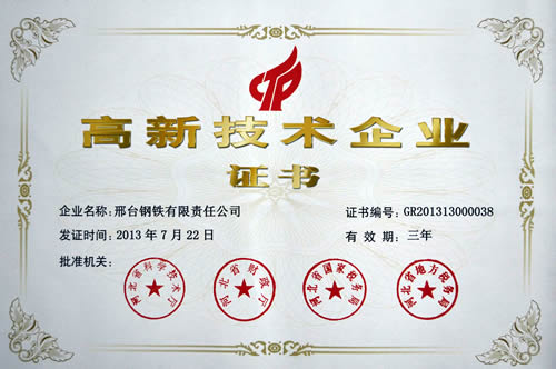2013年7月22日,邢鋼被評為河北省2013年第一批“高新技術(shù)企業(yè)”。