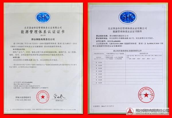 2012年3月至4月,北京國金恒信管理體系認(rèn)證有限公司對(duì)邢鋼進(jìn)行了能源管理體系認(rèn)證審核并順利通過,2012年5月28日頒發(fā)了證書。