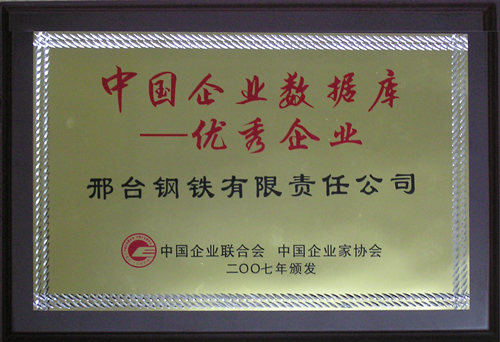 2007年12月,邢鋼榮獲由中國企業(yè)聯(lián)合會、中國企業(yè)家協(xié)會頒發(fā)的“中國企業(yè)數(shù)據(jù)庫優(yōu)秀企業(yè)”榮譽(yù)稱號。