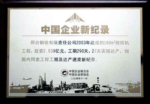 2004年11月,邢鋼2003年建成的180m3燒結(jié)機(jī)工程,投資2.039億元,工期290天,27天實(shí)現(xiàn)達(dá)產(chǎn),創(chuàng)國內(nèi)同類工程工期及達(dá)產(chǎn)速度新紀(jì)錄。