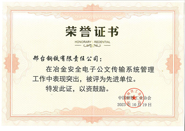 2023年10月,邢鋼在冶金安全電子公文傳輸系統(tǒng)管理工作中表現(xiàn)突出,被中國(guó)鋼鐵工業(yè)協(xié)會(huì)評(píng)為先進(jìn)單位。