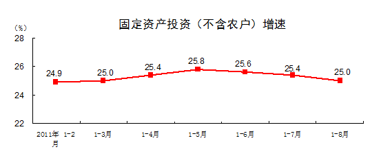 2011年1-8月份,固定資產投資(不含農戶)180608億元,同比增長25%,比1-7月份回落0.4個百分點。其中,國有及國有控股投資62422億元,增長12.1%。從環(huán)比看,8月份固定資產投資(不含農戶)增長1.16%。