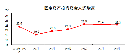 從到位資金情況看,1-8月份,到位資金212194億元,同比增長23.3%。其中,國家預算內資金增長13.1%,國內貸款增長9%,自籌資金增長29.4%,利用外資增長14.1%,其他資金增長17.3%。