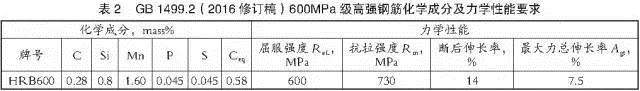 目前國內有沙鋼、承鋼和濟鋼等鋼廠具備成功生產600MPa級熱軋螺紋鋼筋的經驗。表2為GB l499.2(2016修訂稿)對600MPa級高強鋼筋HRB600化學成分和力學性能的要求。