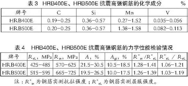 我國在GB 1499.2-2007標準中首次將鋼筋的抗震性能指標納入國標中,并規(guī)定了抗震鋼筋的三個代表性指標:強屈比(R?m /R?eL)、超屈比(R?eL/ReL)和最大力總伸長率(Agt)。國內某鋼廠HRB400E、HRB500E抗震鋼筋多樣品檢驗獲得的化學成分和力學性能指標見表3和表4。