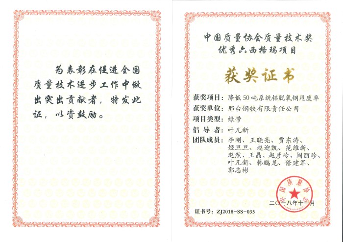 為推廣應(yīng)用六西格瑪?shù)膬?yōu)秀成果,交流、學(xué)習(xí)先進(jìn)典型,促進(jìn)六西格瑪項(xiàng)目水平的提升,邢鋼參加了2018年中國(guó)質(zhì)量協(xié)會(huì)質(zhì)量技術(shù)獎(jiǎng)六西格瑪優(yōu)秀項(xiàng)目申報(bào)。近日獲悉,公司申報(bào)的兩個(gè)六西格瑪項(xiàng)目,均榮獲了2018年中國(guó)質(zhì)量協(xié)會(huì)六西格瑪優(yōu)秀項(xiàng)目獎(jiǎng)。獲獎(jiǎng)項(xiàng)目分別是煉鋼廠主導(dǎo)的《降低50噸系統(tǒng)鋁脫氧甩廢率》項(xiàng)目和技術(shù)中心主導(dǎo)的《降低三線SWRCH35K、SWRCH45K鋼種(Φ20-24mm規(guī)格)裂紋率》項(xiàng)目。