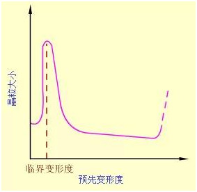 (2)預先變形度 變形度的影響主要與金屬變形的均勻度有關。變形越不均勻, 再結晶退火后的晶粒越大。變形度很小時,因不足以引起再結晶,晶粒不變。當變形度達到2~10%時,金屬中少數(shù)晶粒變形,變形分布很不均勻,所以再結晶時生成的晶核少,晶粒大小相差極大,非常有利于晶粒發(fā)生吞并過程而很快長大,結果得到極粗大的晶粒。使晶粒發(fā)生異常長大的變形度稱作臨界變形度。生產(chǎn)上應盡量避免在臨界變形度范圍內(nèi)的塑性變形加工。超過臨界變形度之后,隨變形度的增大,晶粒的變形更加強烈和均勻,再結晶核心越來越多,因此再結晶后的晶粒越來越細小。但是當變形度過大(約≥90%)時, 晶??赡茉俅纬霈F(xiàn)異常長大,一般認為它是由形變織構造成的。