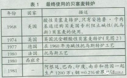 在世界的一些地區(qū)氧氣轉(zhuǎn)爐煉鋼和貝塞麥轉(zhuǎn)爐一直共存至1981年,但是在歐洲止于19世紀(jì)70年代,使用情況見(jiàn)表1。
