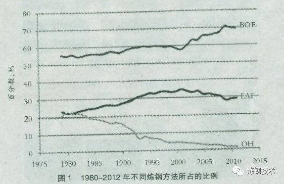 自此,氧氣轉(zhuǎn)爐煉鋼得到快速發(fā)展,而平爐煉鋼開(kāi)始下降,如圖1所示。氧氣轉(zhuǎn)爐煉鋼發(fā)展超過(guò)平爐煉鋼的一個(gè)重要因素是連鑄技術(shù)的引進(jìn)。連鑄要求鋼水源源不斷供應(yīng),而氧氣轉(zhuǎn)爐的工藝時(shí)間比較短,能很容易地滿足連鑄的鋼水供應(yīng),一個(gè)大轉(zhuǎn)爐(350t)的產(chǎn)鋼速度為500t/h。與此相對(duì)照,如果平爐常規(guī)操作,煉鋼至出鋼需要12—14h,或者如果借助工業(yè)用氧加速也需要7—8h。目前在烏克蘭、俄羅斯和印度仍然存在一定數(shù)量的平爐冶煉。這些爐子正逐步被電弧爐取代,2012年平爐工藝總產(chǎn)鋼量1690萬(wàn)t,約占全球鋼產(chǎn)量的1.1%。