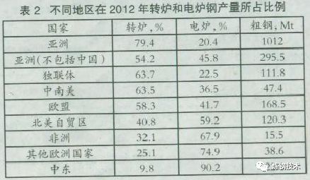 雖然電弧爐煉鋼產(chǎn)量沒(méi)有超過(guò)全球粗鋼總產(chǎn)量的三分之一(在2012年占29.3%),但由于中國(guó)在世界鋼產(chǎn)量的主導(dǎo)地位(占世界總量的46%),且它主要使用氧氣煉鋼,電弧爐煉鋼的影響被忽略,表2顯示了在2012年不同地區(qū)轉(zhuǎn)爐煉鋼及電弧爐煉鋼的相對(duì)比例。