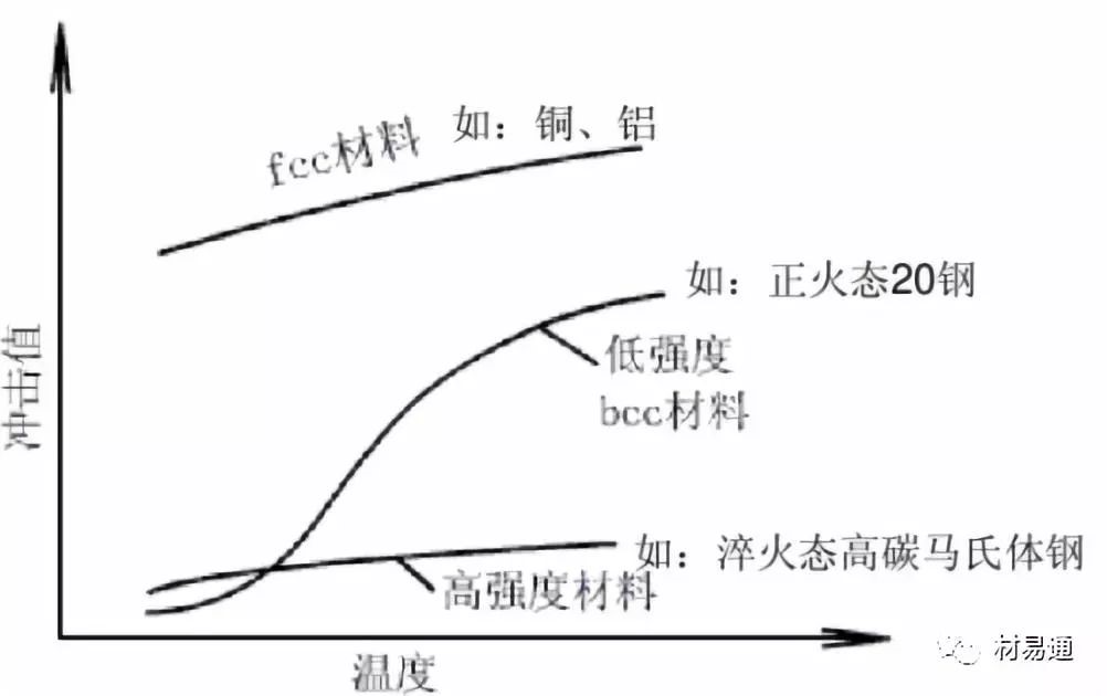 體心立方晶體金屬及合金或某些密排六方晶體金屬及其合金,特別是工程上常用的中、低強(qiáng)度結(jié)構(gòu)鋼(鐵素體-珠光體鋼),在試驗(yàn)溫度低于某一溫度tk時(shí),會(huì)由韌性狀態(tài)變?yōu)榇嘈誀顟B(tài),沖擊吸收功明顯下降,斷裂機(jī)理由微孔聚集型變?yōu)榇┚Ы饫恚瑪嗫谔卣饔衫w維狀變?yōu)榻Y(jié)晶狀,這就是低溫脆性,又稱為冷脆。這種轉(zhuǎn)變稱為韌脆轉(zhuǎn)變。轉(zhuǎn)變溫度稱為韌脆轉(zhuǎn)變溫度,又稱為冷脆轉(zhuǎn)變溫度。