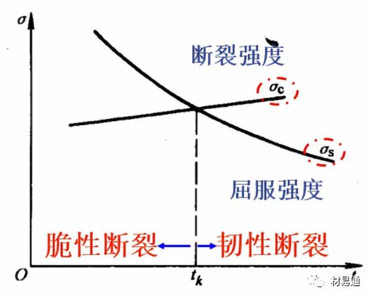 低溫脆性是材料屈服強(qiáng)度隨著溫度的降低急劇增加的結(jié)果;見右圖,屈服點(diǎn)隨著溫度的下降而升高,但材料的斷裂強(qiáng)度隨著溫度的變化很??;兩線交點(diǎn)對(duì)應(yīng)的溫度就是tk。