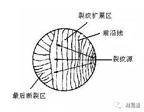 疲勞斷裂經(jīng)歷了裂紋萌生和擴展過程。由于應力水平較低,因此具有較明顯的裂紋萌生和穩(wěn)態(tài)擴展階段,疲勞斷裂的宏觀斷口一般由三個區(qū)域組成,即疲勞裂紋產(chǎn)生區(qū)(裂紋源)、裂紋擴展區(qū)和最后斷裂區(qū)。