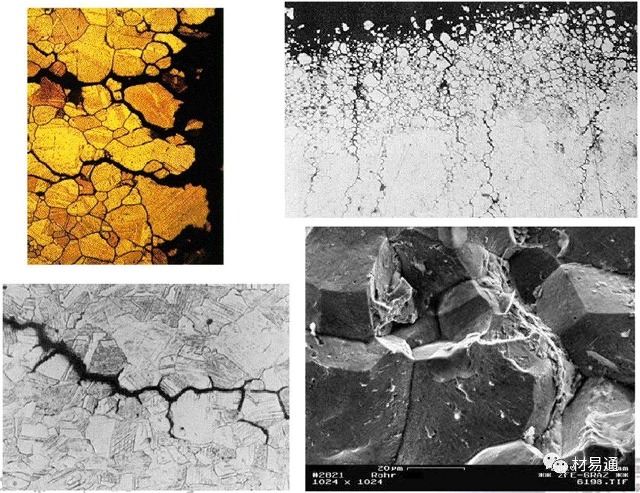 SCC裂紋分為三種:晶間型、穿晶型、混合型。晶間型:裂紋沿晶界擴展,如軟鋼、鋁合金、銅合金、鎳合金;穿晶型:裂紋穿越晶粒擴展,如奧氏體不銹鋼、鎂合金;混合型:鈦合金。