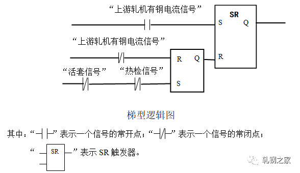 在軋件頭部進(jìn)入活套后面軋機前不允許起套輥升起;在軋件頭部進(jìn)入活套后面軋機后起套輥必須立即升起。當(dāng)軋件尾部離開活套前面軋件時,起套輥必須立即下降。為了準(zhǔn)確地起落套,我們首先,在活套的起落套的邏輯控制程序中設(shè)置了RS觸發(fā)器。只要下游機架“有鋼”活套就不能再次起落套。編程如下(梯型邏輯圖):其次,在起套和落套的處理上對延時時間采用了長度系數(shù)補償?shù)乃惴?,即在計算定時器的延時時間過程中將線材要走的長度(如兩機架間的距離)乘以一個百分比。這樣就可以:一、消除由于CPU軟件系統(tǒng)本身運行周期過長造成的定時計算誤差;二、靈活地適應(yīng)電氣開關(guān)和機械上氣閥等的動作滯后的不一致性,以使起套輥能較準(zhǔn)確地升起和落下。