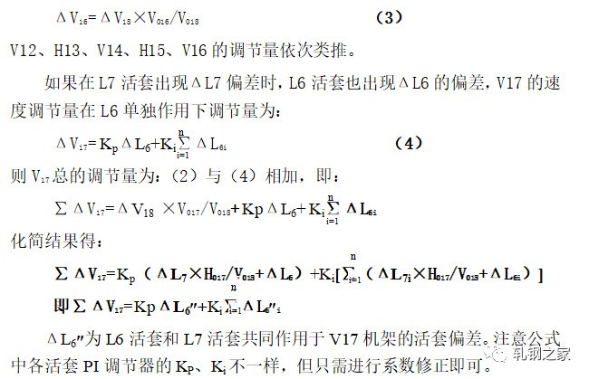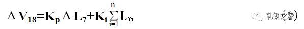 當(dāng)活套一旦形成以后,活套的實際高度立即由活套掃描器測得的值經(jīng)過PI調(diào)節(jié)器,輸出一個控制信號,通過控制上游軋機,使活套大小得到調(diào)節(jié),使活套保持在設(shè)定的高度范圍。速度調(diào)節(jié)量是按逆流調(diào)速的方法,按同樣比例對軋機的工作速度進(jìn)行級聯(lián)調(diào)節(jié)。假如活套L7出現(xiàn)高度差為ΔL7,則V18機架的速度調(diào)節(jié)是: