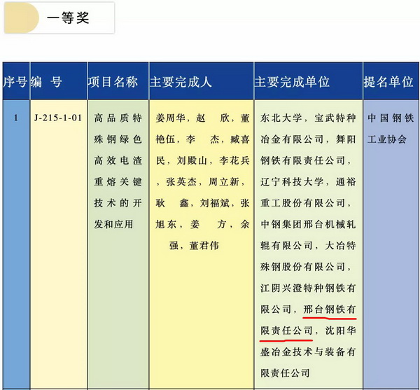 The State Science and Technology Progress Award is one of three state-level science and technology awards established by the State Council, which also include the State Natural Science Award and the State Technological Innovation Award.There is a review each year. The projects which won the first prize are 15% of the whole winning projects. This year, only 22 projects won the first prize of National Science & Technology Progress Award. The project of “Development and application of the key technology of green and efficient electroslag remelting of high-qualityspecial steel” which is jointly participated by Xingtai Steel won the prize. As the principal head, Doctor Jiangfang also won the first prize of individual award.