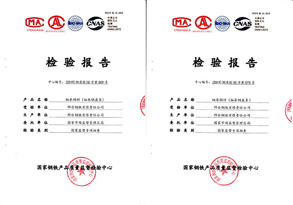 受國(guó)家市場(chǎng)監(jiān)督管理總局委托,2019年11月國(guó)家鋼鐵產(chǎn)品質(zhì)量監(jiān)督檢驗(yàn)中心對(duì)邢鋼高碳鉻軸承鋼進(jìn)行了監(jiān)督抽查,判定依據(jù)為《2019年軸承鋼材產(chǎn)品質(zhì)量國(guó)家監(jiān)督專項(xiàng)抽查方案》,現(xiàn)場(chǎng)抽取了2個(gè)批次盤條,近日公司收到檢測(cè)報(bào)告2個(gè),結(jié)論為:所檢項(xiàng)目符合GB/T18254-2016《高碳鉻軸承鋼》標(biāo)準(zhǔn)及抽樣方案,判定合格,報(bào)告中顯示,7大項(xiàng)29個(gè)項(xiàng)目結(jié)果全部高于該產(chǎn)品標(biāo)準(zhǔn),達(dá)到了高級(jí)優(yōu)質(zhì)鋼級(jí)別水平。
