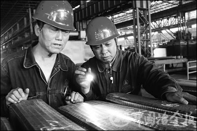 圖為邢鋼線材廠員工對(duì)修磨鋼坯進(jìn)行檢驗(yàn)的現(xiàn)場。