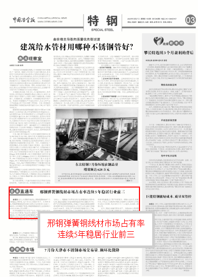 本報訊 近日,從邢鋼傳來消息,邢鋼彈簧鋼線材7月份銷量達4786噸,是今年初以來最好水平。從2015年起,邢鋼彈簧鋼線材在國內(nèi)市場占有率穩(wěn)居行業(yè)前三。2019年,受環(huán)保限產(chǎn)影響,邢鋼彈簧鋼線材在全國市場占有率為21.19%,居全國第二。