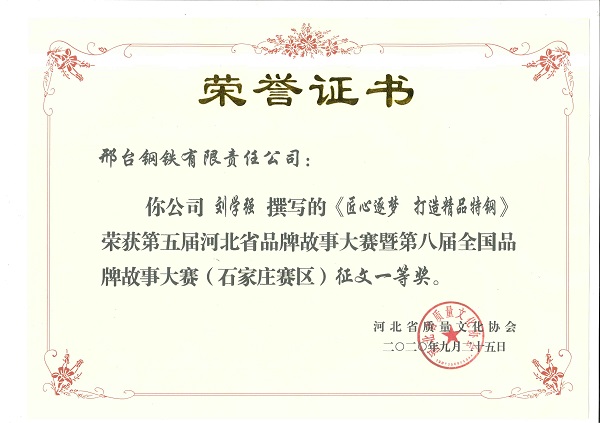 經(jīng)過參賽選手激烈角逐和專家評委綜合點評,最終邢鋼代表團2個演講作品和4個征文作品獲獎,其中《匠心逐夢,打造精品特鋼》征文作品榮獲一等獎,《聚團隊之力,鑄精品之鋼》等3篇征文作品榮獲二等獎,《挑戰(zhàn)不可能》和《匠心鑄造邢鋼百年品牌,特鋼企業(yè)再創(chuàng)新的輝煌》2個演講作品榮獲三等獎。