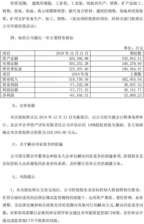 11月13日晚間,八一鋼鐵發(fā)布公告稱,該公司控股股東寶鋼集團(tuán)新疆八一鋼鐵有限公司的控股子公司新疆天山鋼鐵聯(lián)合有限公司擬受讓深圳九天清控投資合伙企業(yè)持有的新興鑄管新疆有限公司100%股權(quán)。11月13日,天山鋼鐵與九天清控簽署了《股權(quán)轉(zhuǎn)讓協(xié)議》。本次股權(quán)轉(zhuǎn)讓以2019年12月31日為基準(zhǔn)日,以公司經(jīng)天健會計(jì)師事務(wù)所審計(jì)、北京中企華資產(chǎn)評估有限責(zé)任公司評估后的100%股權(quán)價值為基礎(chǔ),各方協(xié)商確定本次股權(quán)轉(zhuǎn)讓價款為21.81億元。