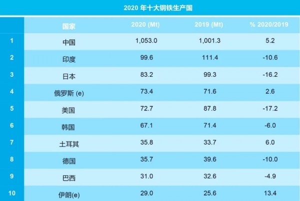 2020年十大鋼鐵生產(chǎn)國