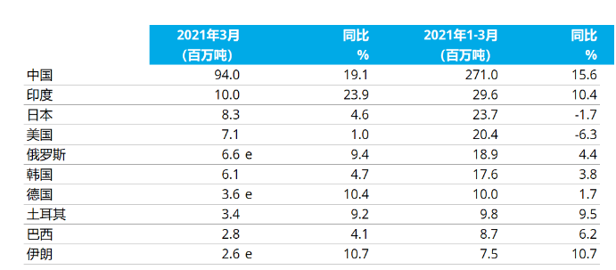 2021年1-3月粗鋼產(chǎn)量累計(jì)前十位的國家
