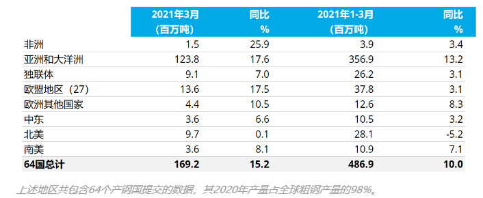 世界鋼協(xié):2021年3月全球粗鋼產(chǎn)量1.692億噸