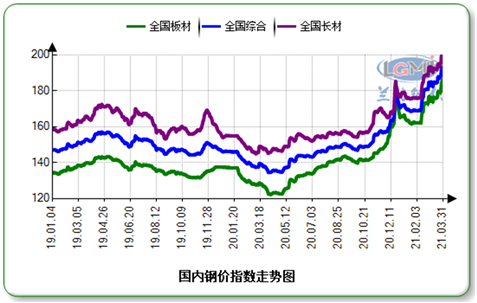 一季度,在需求提振、成本支撐、環(huán)保加碼、國內(nèi)外大宗商品整體上漲帶動下,國內(nèi)鋼鐵市場震蕩上行,據(jù)蘭格鋼鐵云商平臺監(jiān)測數(shù)據(jù)顯示,一季度,蘭格鋼鐵綜合鋼材價格指數(shù)均值為177,同比上升22.5%;長材價格指數(shù)為184.2,同比上升22.5%;板材價格指數(shù)為169.7,同比上升29.0%。從鋼材均價來看,一季度蘭格鋼鐵綜合鋼材均價為4868元/噸,較上年同期上漲同比上漲977元/噸,同比上漲25.1%。