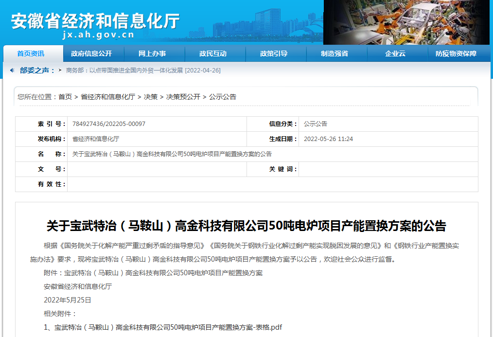 根據(jù)《國(guó)務(wù)院關(guān)于化解產(chǎn)能?chē)?yán)重過(guò)剩矛盾的指導(dǎo)意見(jiàn)》《國(guó)務(wù)院關(guān)于鋼鐵行業(yè)化解過(guò)剩產(chǎn)能實(shí)現(xiàn)脫困發(fā)展的意見(jiàn)》和《鋼鐵行業(yè)產(chǎn)能置換實(shí)施辦法》要求,現(xiàn)將寶武特冶(馬鞍山)高金科技有限公司50噸電爐項(xiàng)目產(chǎn)能置換方案予以公告,歡迎社會(huì)公眾進(jìn)行監(jiān)督。