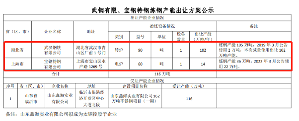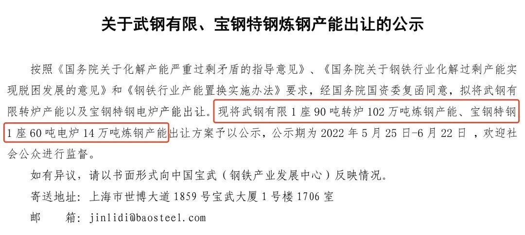 按照《國(guó)務(wù)院關(guān)于化解產(chǎn)能?chē)?yán)重過(guò)剩矛盾的指導(dǎo)意見(jiàn)》、《國(guó)務(wù)院關(guān)于鋼鐵行業(yè)化解過(guò)剩產(chǎn)能實(shí)現(xiàn)脫困發(fā)展的意見(jiàn)》和《鋼鐵行業(yè)產(chǎn)能置換實(shí)施辦法》要求,經(jīng)國(guó)務(wù)院國(guó)資委復(fù)函同意,擬將武鋼有限轉(zhuǎn)爐產(chǎn)能以及寶鋼特鋼電爐產(chǎn)能出讓?,F(xiàn)將武鋼有限1座90噸轉(zhuǎn)爐102萬(wàn)噸煉鋼產(chǎn)能、寶鋼特鋼1座60噸電爐14萬(wàn)噸煉鋼產(chǎn)能出讓方案予以公示,公示期為2022年5月25日-6月22日,歡迎社會(huì)公眾進(jìn)行監(jiān)督。