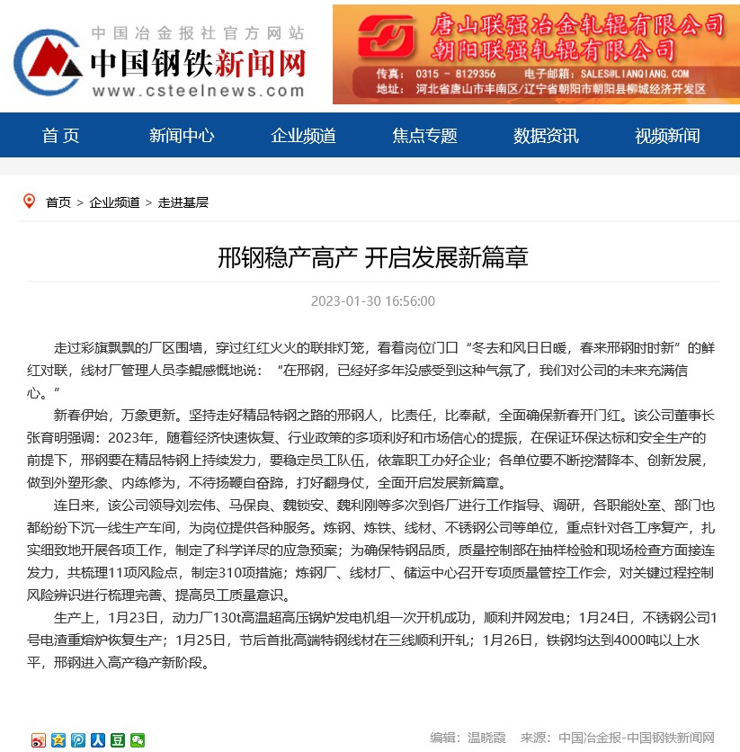 新春伊始,萬象更新。堅(jiān)持走好精品特鋼之路的邢鋼人,比責(zé)任,比奉獻(xiàn),全面確保新春開門紅。該公司董事長張育明強(qiáng)調(diào):2023年,隨著經(jīng)濟(jì)快速恢復(fù)、行業(yè)政策的多項(xiàng)利好和市場信心的提振,在保證環(huán)保達(dá)標(biāo)和安全生產(chǎn)的前提下,邢鋼要在精品特鋼上持續(xù)發(fā)力,要穩(wěn)定員工隊(duì)伍,依靠職工辦好企業(yè);各單位要不斷挖潛降本、創(chuàng)新發(fā)展,做到外塑形象、內(nèi)練修為,不待揚(yáng)鞭自奮蹄,打好翻身仗,全面開啟發(fā)展新篇章。