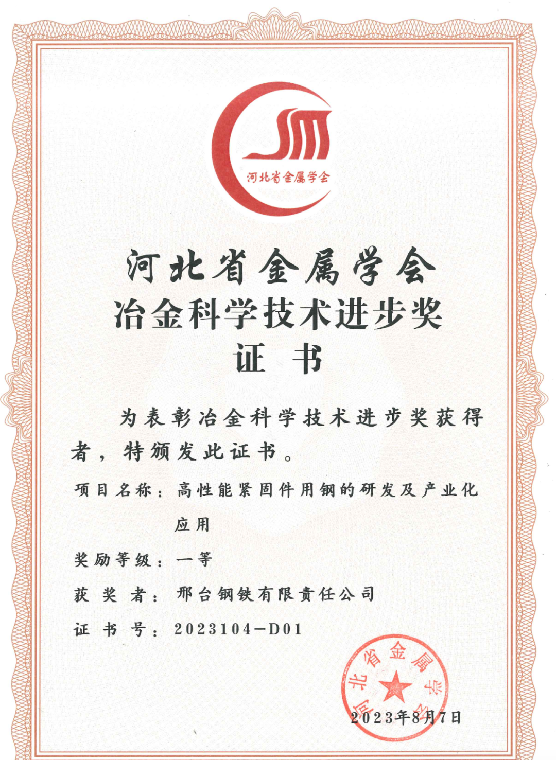 近日,邢臺鋼鐵有限責任公司兩項科技研發(fā)項目“高性能緊固件用鋼的研發(fā)及產(chǎn)業(yè)化應(yīng)用項目”“汽車底盤異形件用大規(guī)格高淬透性高潔凈度冷鐓鋼的研發(fā)及應(yīng)用”得到河北省金屬學會專家評審委員會的高度認可,分別榮獲2023年度的 “河北冶金科學技術(shù)獎”一、二等獎。