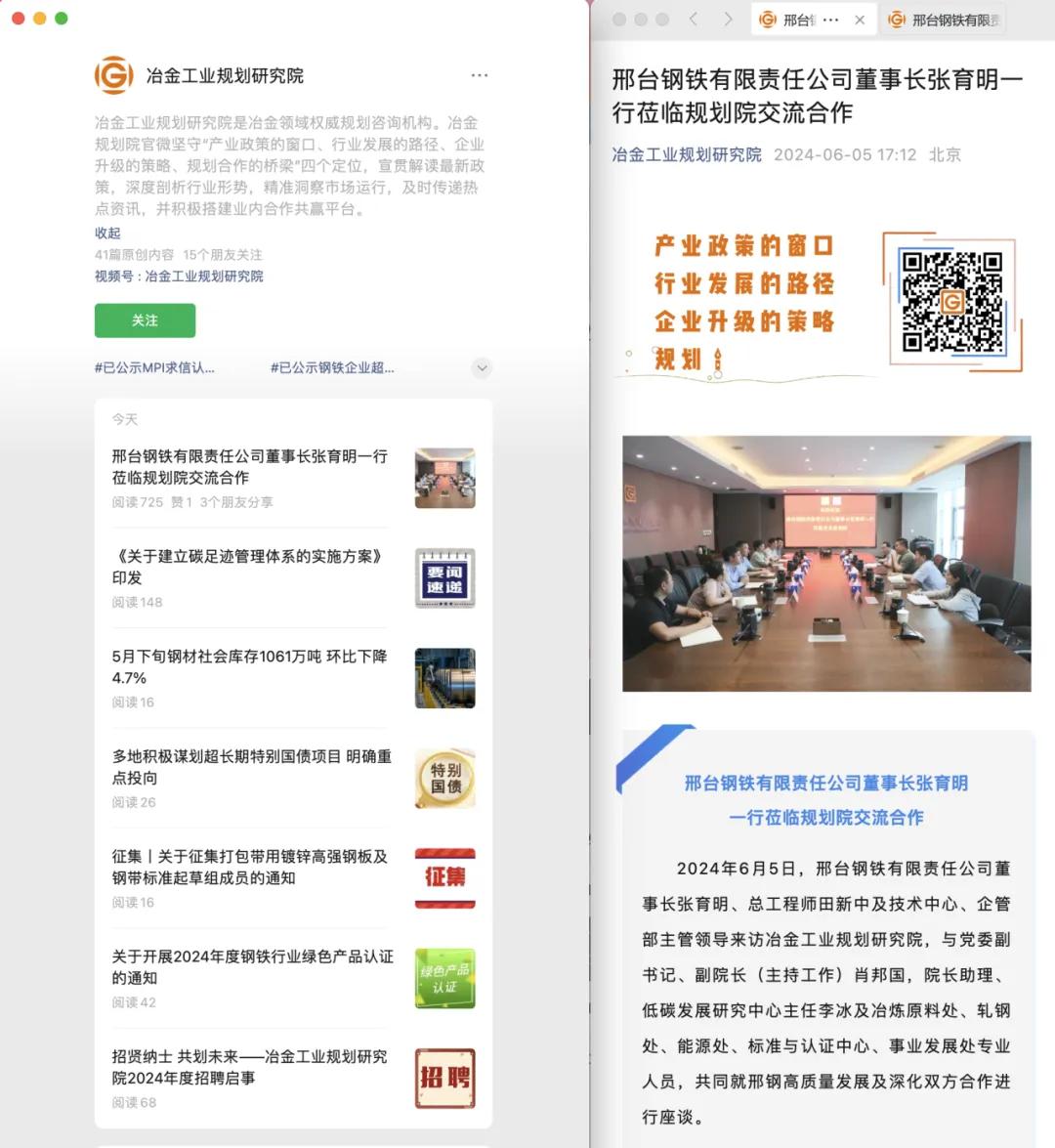 2024年6月5日,邢臺(tái)鋼鐵有限責(zé)任公司黨委書記、董事長(zhǎng)張育明在總工程師兼董事長(zhǎng)、總經(jīng)理助理田新中及技術(shù)中心、企管部相關(guān)負(fù)責(zé)人的陪同下,到訪冶金工業(yè)規(guī)劃研究院,與黨委副書記、副院長(zhǎng)(主持工作)肖邦國,院長(zhǎng)助理、低碳發(fā)展研究中心主任李冰及冶煉原料處、軋鋼處、能源處、標(biāo)準(zhǔn)與認(rèn)證中心、事業(yè)發(fā)展處專業(yè)人員,共同就邢鋼高質(zhì)量發(fā)展及深化雙方合作進(jìn)行座談。