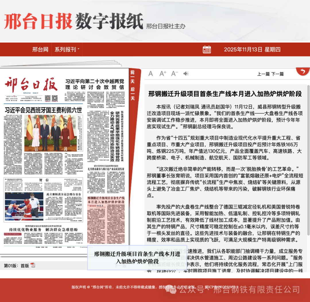 率先投產(chǎn)的大盤卷生產(chǎn)線整合了德國三輥減定徑軋機(jī)和美國普銳特卷取機(jī)等國際先進(jìn)裝備,采用智能加熱、低溫軋制、控軋控冷等多項特鋼軋制前沿工藝技術(shù),有效降低了線材加工成本,顯著提升了產(chǎn)品附加值。由其生產(chǎn)的特鋼產(chǎn)品,尺寸精度可穩(wěn)定控制在±0.1毫米以內(nèi),誤差尺寸約等于一根頭發(fā)絲的直徑。這些先進(jìn)技術(shù)與裝備的融合,讓邢鋼在特鋼生產(chǎn)的精度、效率和品質(zhì)上實現(xiàn)質(zhì)的飛躍,可滿足大規(guī)模生產(chǎn)特高級鋼種需求。“為了讓項目全速推進(jìn),我們從各職能部門抽調(diào)精干力量,成立服務(wù)專班,前期已為項目解決供水管道施工、周邊公路建設(shè)等一系列問題。”服務(wù)專班值班組長侯立中表示,他們將持續(xù)優(yōu)化服務(wù)流程,常態(tài)化開展“上門服務(wù)”“現(xiàn)場辦公”,實時跟蹤項目施工進(jìn)度,及時協(xié)調(diào)解決項目建設(shè)中的一線難題,保障項目按時間節(jié)點(diǎn)高效推進(jìn),早日建成投產(chǎn)。“眼下,我們正對標(biāo)國內(nèi)首鋼智新等先進(jìn)企業(yè),瞄準(zhǔn)高強(qiáng)度耐熱鋼等八大系列的高精尖產(chǎn)品,加大科技研發(fā)投入力度,全面提升產(chǎn)品附加值,實現(xiàn)高端化、綠色化、智能化升級,為我國高端裝備制造業(yè)提供關(guān)鍵材料支撐。”馬保良說。